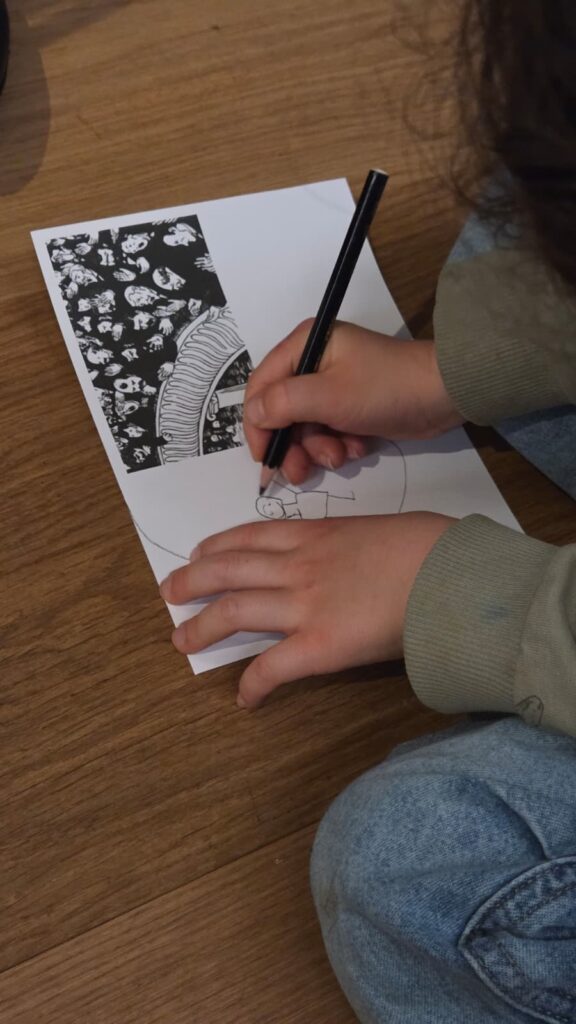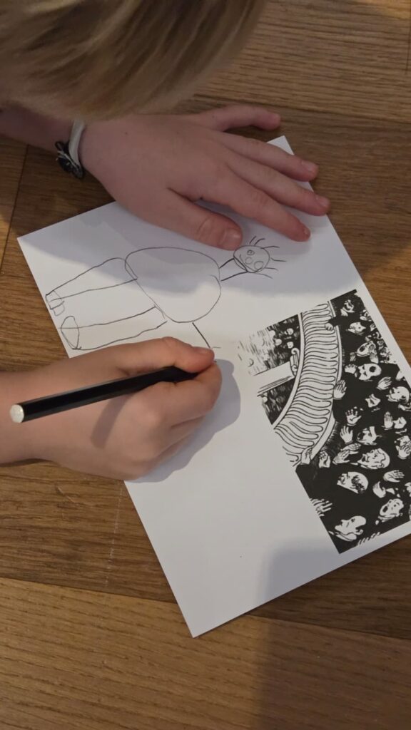 Voici la même scène mais en gravure. Gabrielle nous a donné le tableau en petit sur une feuille, et nous avons dessiné la suite du tableau. Nous avons imaginé des spectacles différents : de la capoeira, un clown,…etc