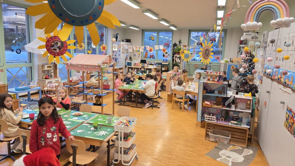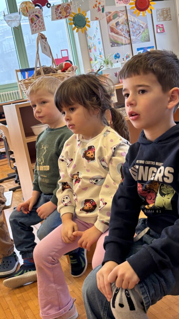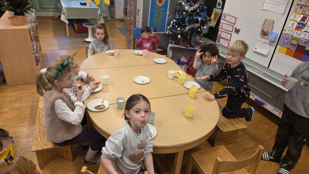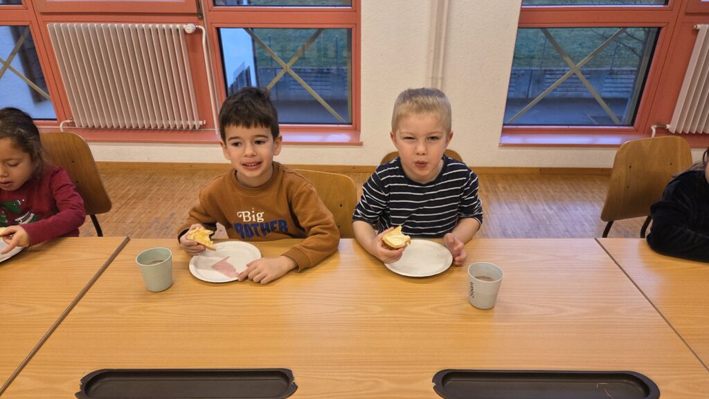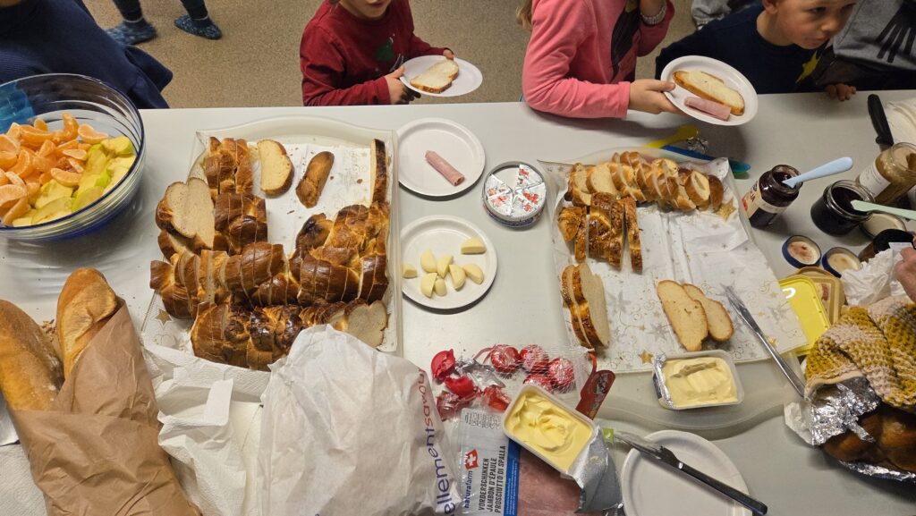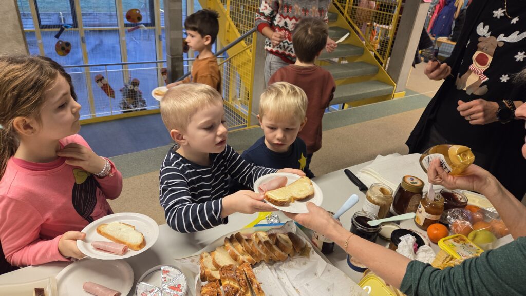 Les maîtresses ont installé un buffet de tartines dans notre corridor. L’autre classe de 1-2P et la classe de 3P nous ont rejoint ! Il y avait même Philippe qui est venu aidé !