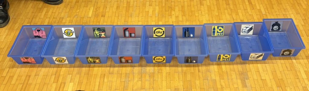 Estelle nous a ensuite présenté 9 autres poubelles: pour les habits, pour les piles, pour l’aluminium, pour les boîtes en fer, pour le papier et le carton, pour le verre, pour le PET et le compost. Et bien sûr la poubelle dont on a déjà parlé, pour les déchets non recyclables.
