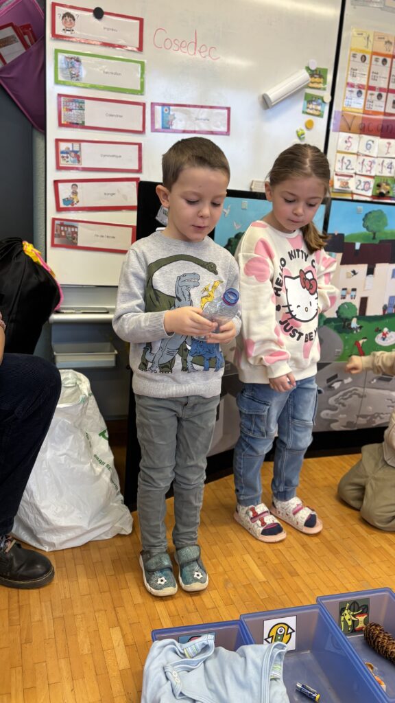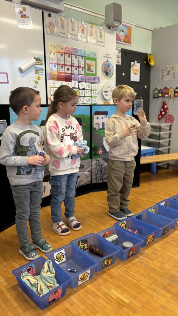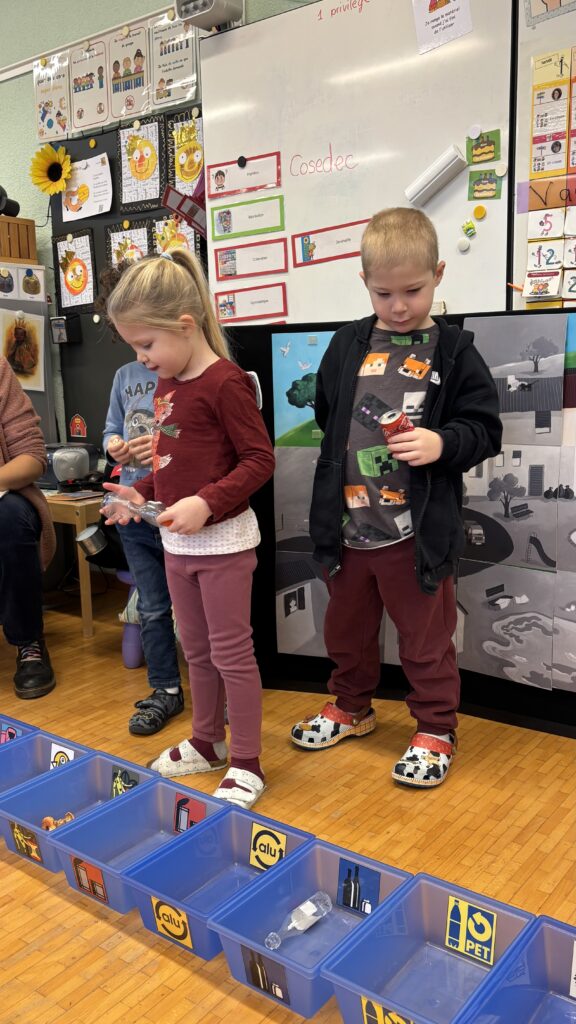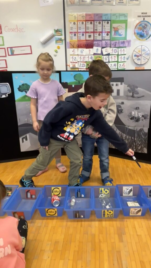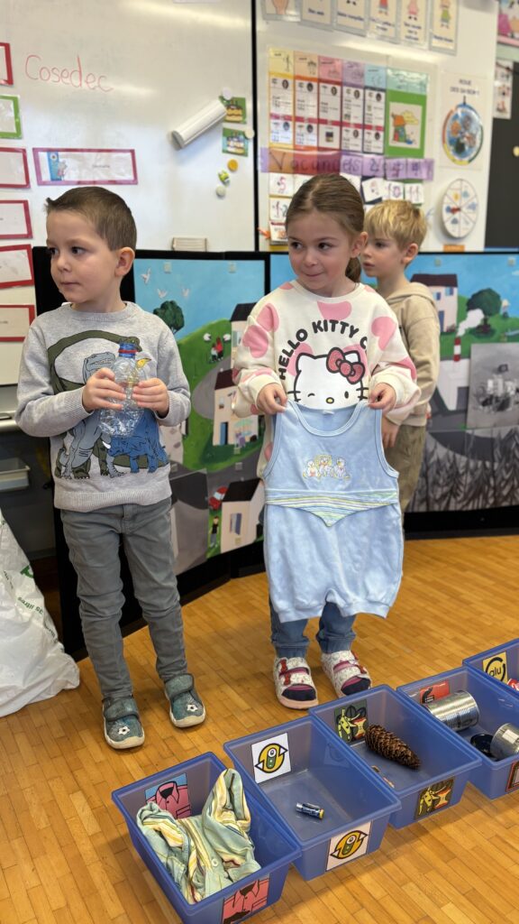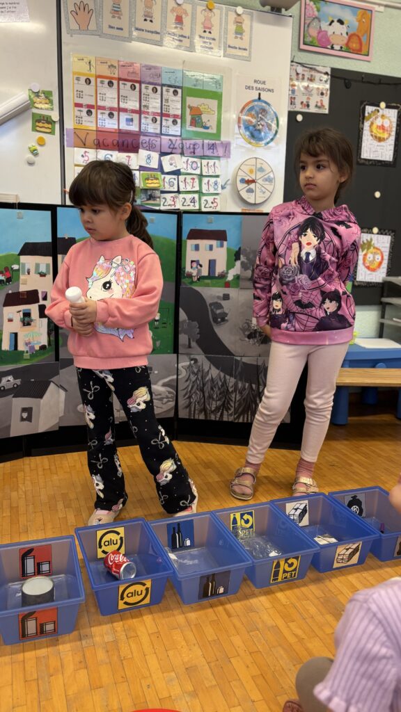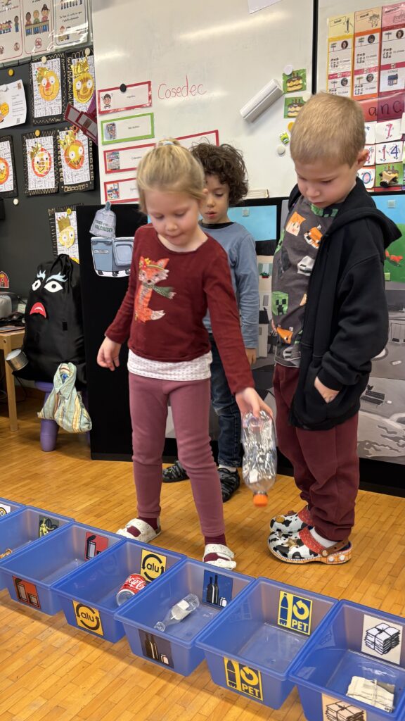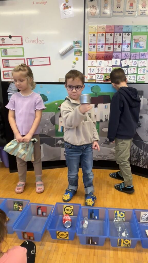 Estelle nous a aussi présenté Madame Poubelle. Elle a plein de déchets qui ne sont pas jetés dans la bonne poubelle, et cela la rend triste. Alors nous l’avons aidée à trier tout ça…